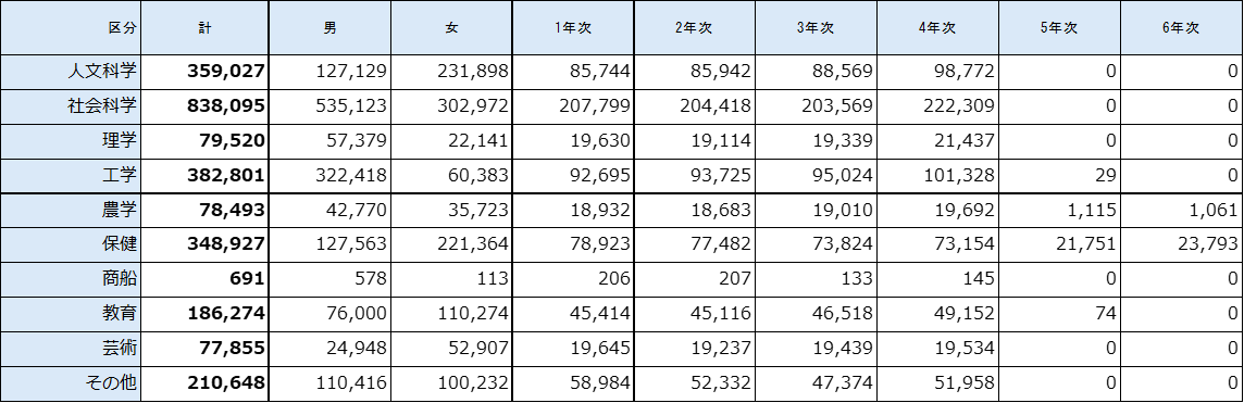 上記を見ますと理学部、農学部、家政、芸術などは7万人台と数が少ないことがわかります。