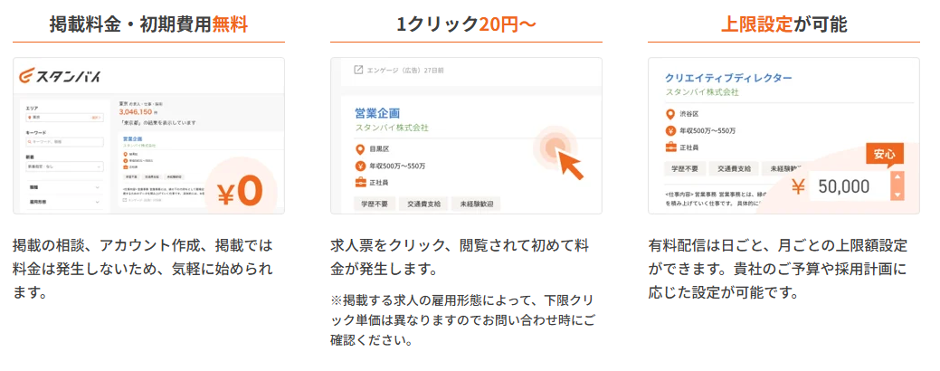 スタンバイはクリック課金の為、求人票を閲覧されて初めて費用が発生します。応募や採用時に成功報酬はいただきません。小額からでも効率的に求職者にアプローチできます。